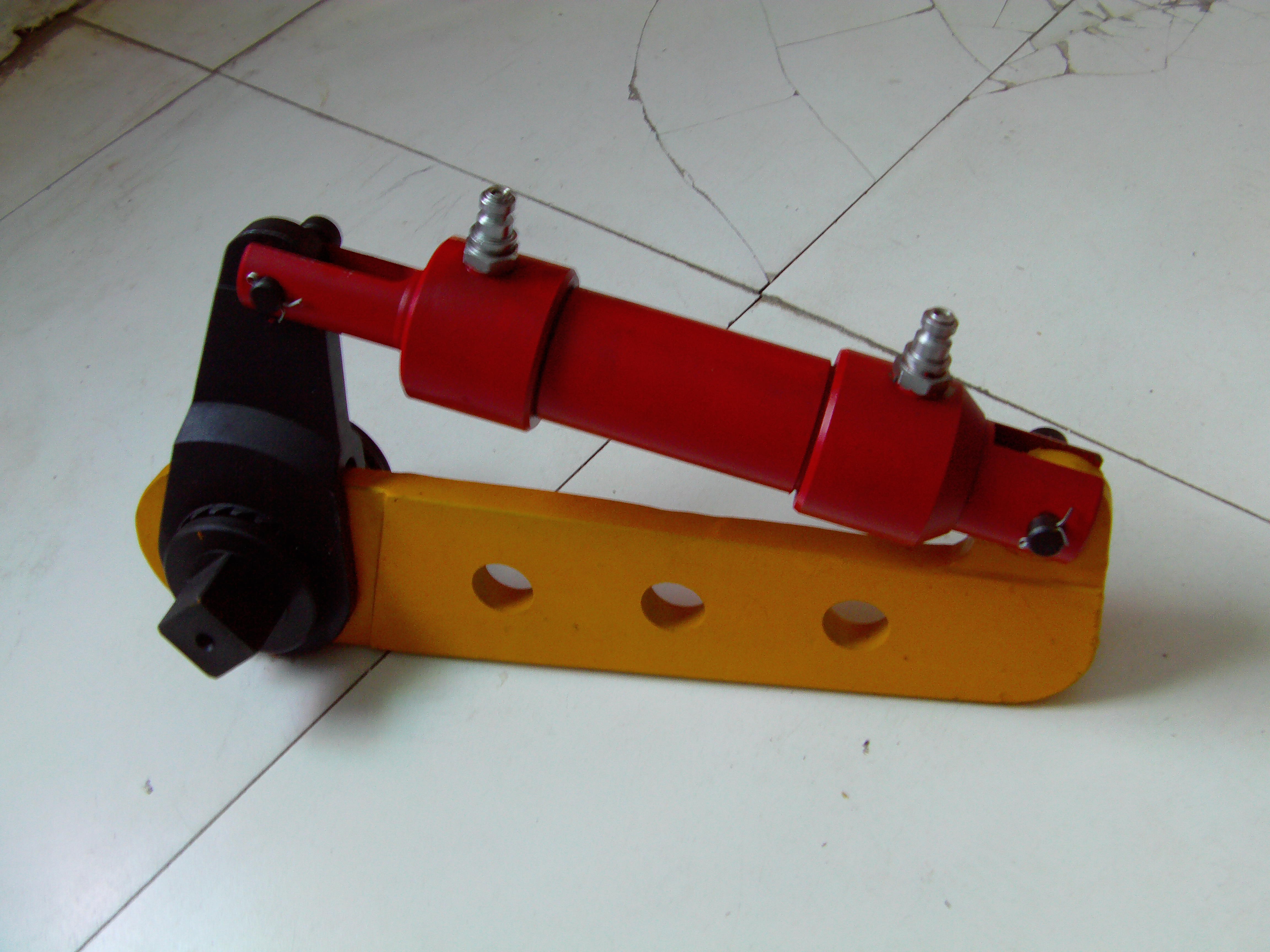 大功率液壓扳手由手動(dòng)高壓泵和帶棘輪式液壓扭矩扳手兩部分組成。操縱手動(dòng)高壓泵的手柄,液壓缸產(chǎn)生推力,經(jīng)過曲柄系統(tǒng)形成力矩,帶動(dòng)螺母轉(zhuǎn)動(dòng)一個(gè)角度,